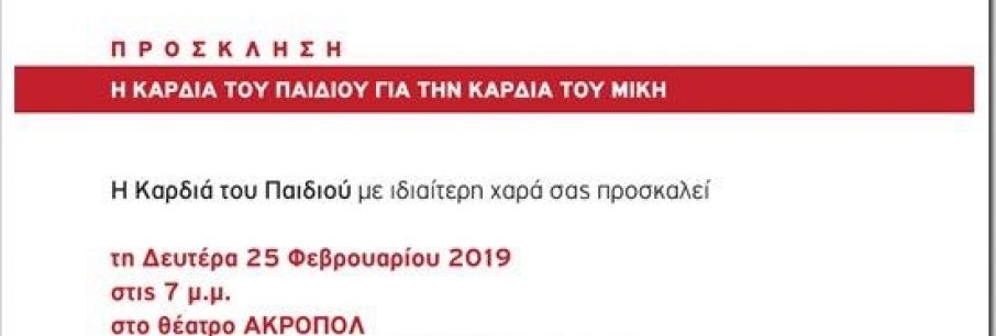 ΠΡΟΣΚΛΗΣΗ Η Καρδιά του Παιδιού με ιδιαίτερη χαρά σας προσκαλεί Τη Δευτέρα 25 Φεβρουαρίου 2019 στις 7 μ.μ στο θέατρο ΑΚΡΟΠΟΛ [Ιπποκράτους 9, Αθήνα- τηλ.210 3648303] Η παιδική χορωδί[...]