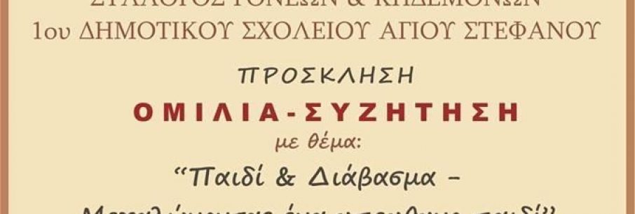 Ο Σύλλογος Γονέων και Κηδεμόνων του 1ου Δημοτικού Σχολείου του Αγ. Στεφάνου και η διευθύντρια Κα Ελένη Μουλού διοργανώνουν Ομιλία-Συζήτηση με θέμα: «Παιδί και Διάβασμα-Μεγαλώνοντας[...]