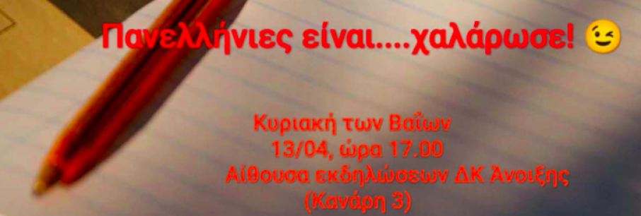 Μια άλλη ματιά στις πανελλήνιες εξετάσεις προτείνει η εκδήλωση που οργανώνει το Τμήμα Διαβούλευσης και Εθελοντισμού του Δήμου Διονύσου, την Κυριακή 13 Απριλίου στις 5 το απόγευμα, [...]