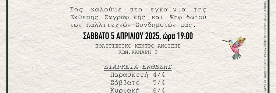 28 καλλιτέχνες συμπολίτες συμμετέχουν με έργα ζωγραφικής και ψηφιδωτού στην ομαδική έκθεση που πραγματοποιείται στο Πολιτιστικό Κέντρο της Άνοιξης (Κανάρη 3) υπό την αιγίδα της Αντ[...]