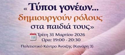 ΠΡΟΣΚΛΗΣΗ Ο Δήμος Διονύσου σε συνεργασία με το Τμήμα Διαβούλευσης και Εθελοντισμού προσκαλούν σε ομιλία με θέμα «Τύποι γονέων… δημιουργούν ρόλους στα παιδιά τους». Ομιλήτριες οι Σ.[...]