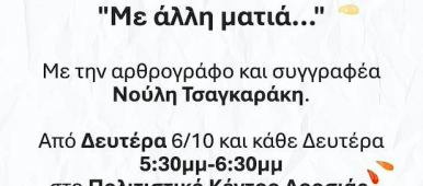 Στο Πολιτιστικό Κέντρο της Δροσιάς, κάθε Δευτέρα, συνεχίζεται φέτος, για δεύτερη χρονιά το πρόγραμμα της Δημοτικής Βιβλιοθήκης Διονύσου “Με άλλη ματιά…”, υπό την καθοδήγηση της αρθ[...]