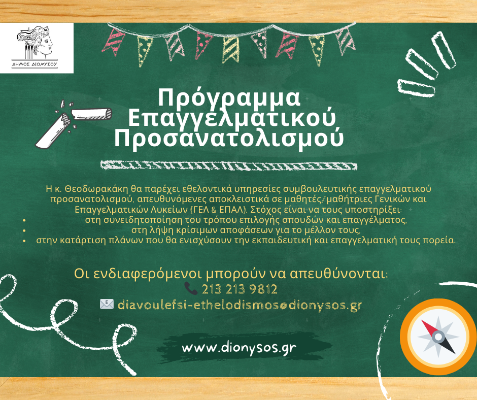 Η Αντιδημαρχία Πολιτισμού, Εθελοντισμού & Φιλοζωίας, σε συνεργασία με την Αντιδημαρχία Παιδείας, Δια Βίου Μάθησης, Αθλητισμού & Νέας Γενιάς, ανακοινώνουν με χαρά την επανέναρξη του Προγράμματος Επαγγελματικού Προσανατολισμού του Δήμου Διονύσου.