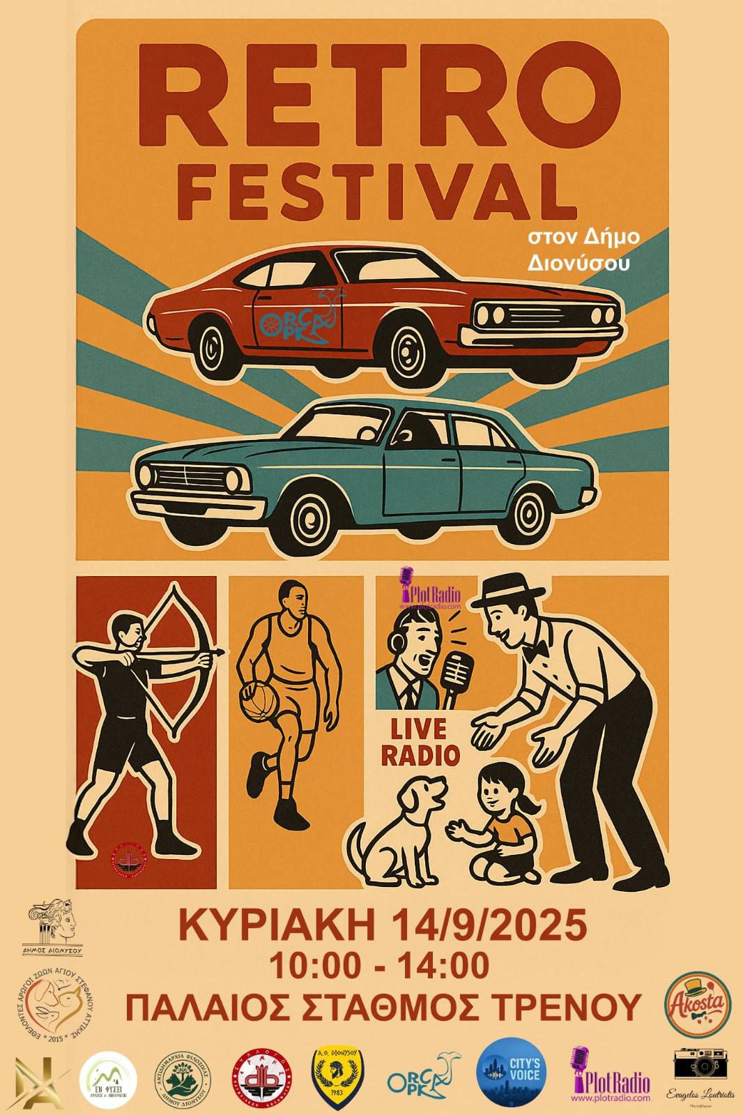 Ο Δήμος Διονύσου, η Λέσχη Αυτοκινήτων Όρκα και σειρά φορέων του Δήμου Διονύσου οργανώνουν την Κυριακή 14 Σεπτεμβρίου, στον Παλαιό Σταθμό του Τρένου στον Διόνυσο, την έκθεση 80 αυτοκινήτων αντίκας με τίτλο Retrofestival στον Διόνυσο.