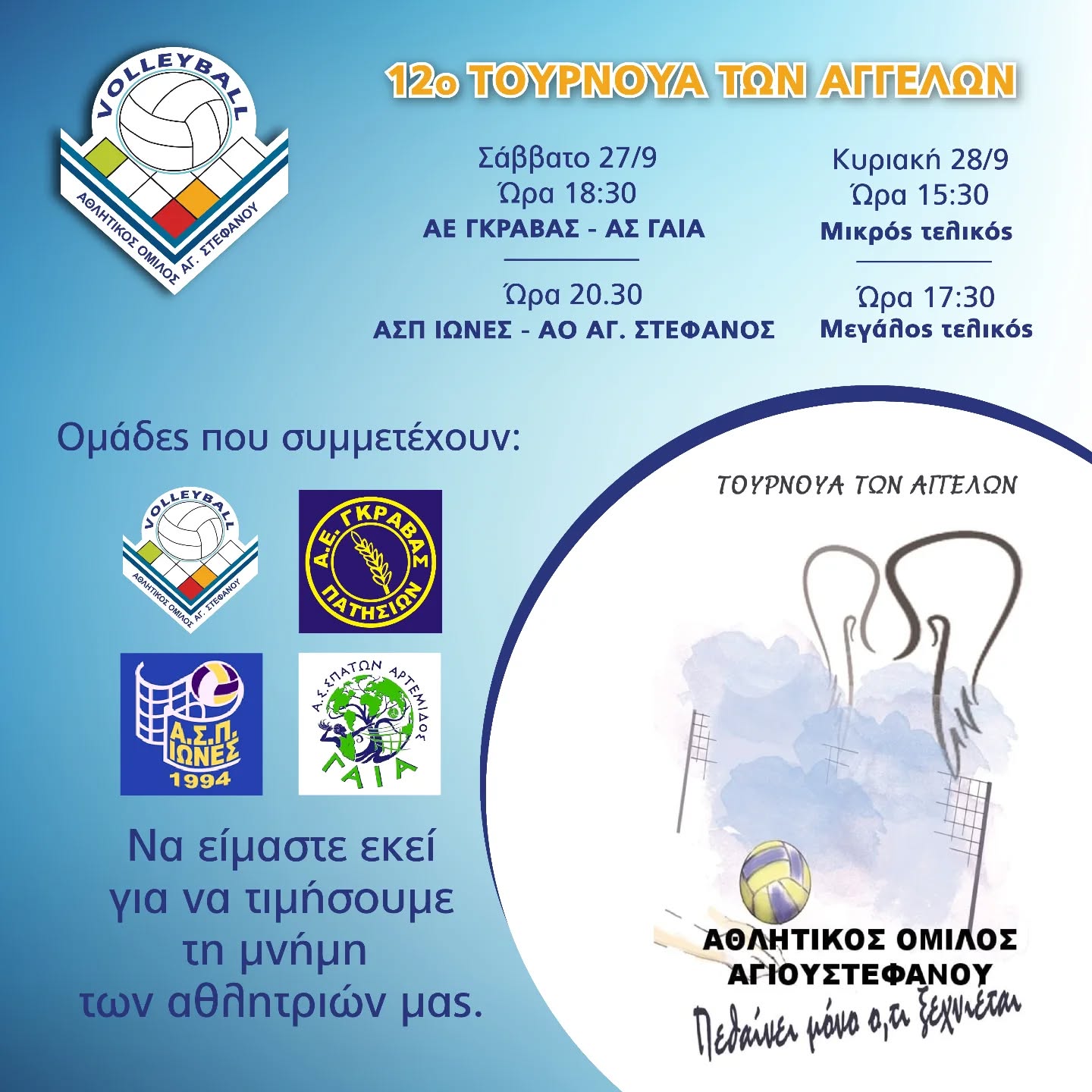 12 χρόνια από τον αδόκητο και άδικο χαμό των τεσσάρων 16χρονων αθλητριών βόλλεϋ του Αθλητικού Ομίλου Αγ. Στεφάνου, που έχασαν τη ζωή τους σε πολύνεκρο τροχαίο δυστύχημα το 2013. Ο ΑΟ Αγ. Στεφάνου τιμά τη μνήμη της Κατερίνας Παρίση, της Μερίνης Σταυρουλάκη, της Μαρίνας Πρίφτη και της Σίας Καραγεωργίου με το Τουρνουά των Αγγέλων, που φέτος θα πραγματοποιηθεί το Σαββατοκύριακο 27 και 28 Σεπτεμβρίου, με τη συμμετοχή της ΑΕ Γκράβας, του ΑΣ Σπάτων Αρτέμιδας ΓΑΙΑ και του ΑΣΠ Ίωνες.