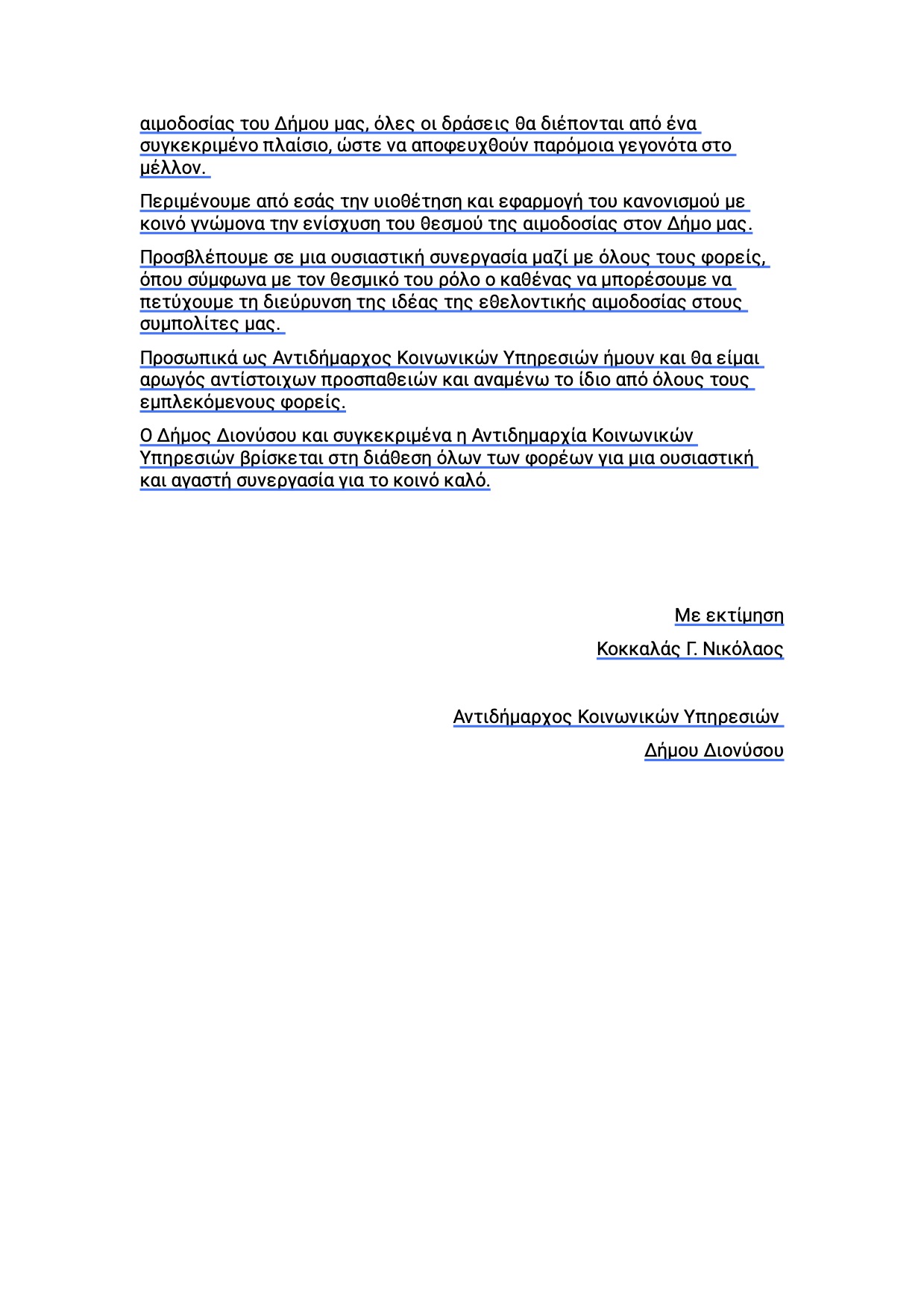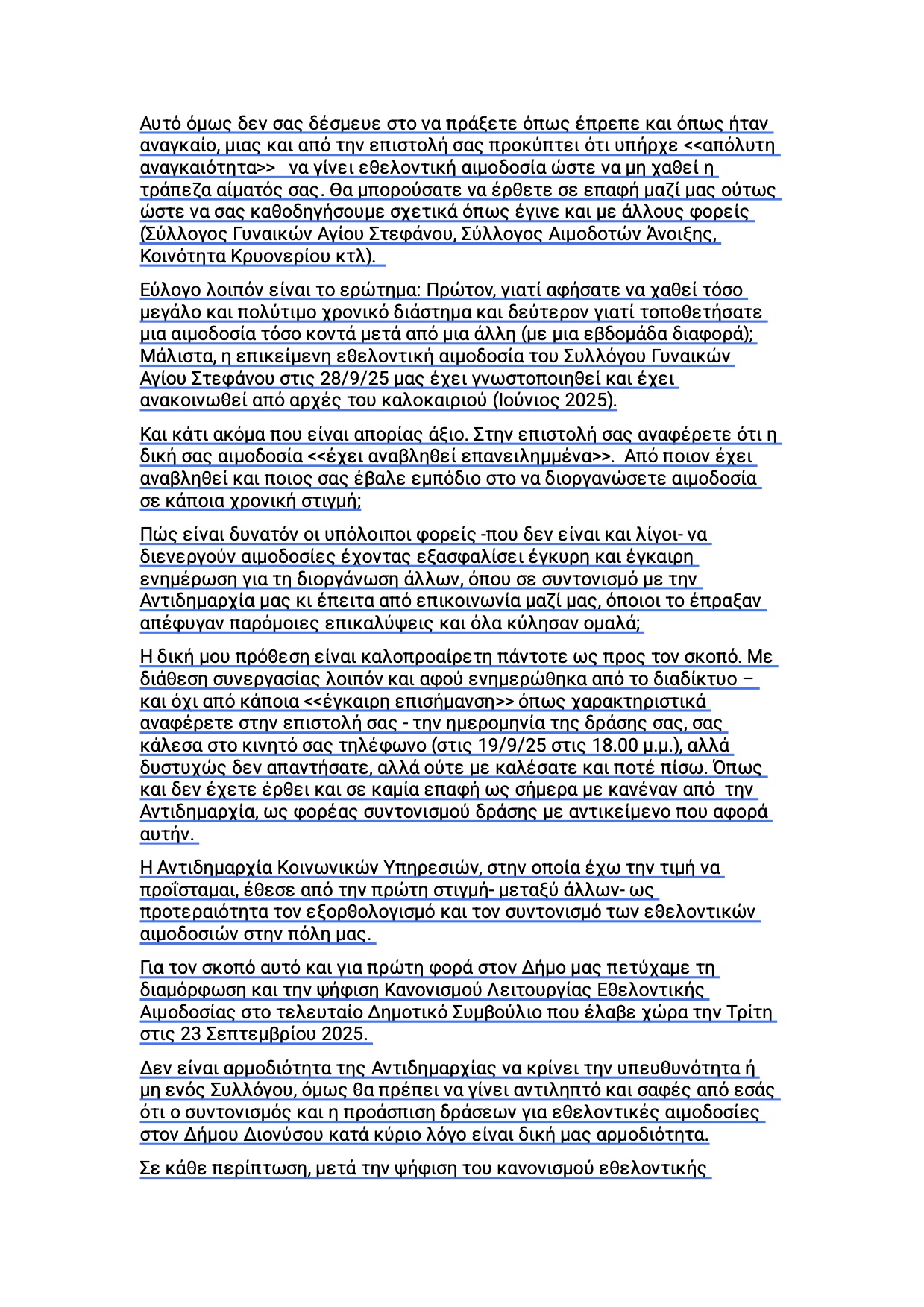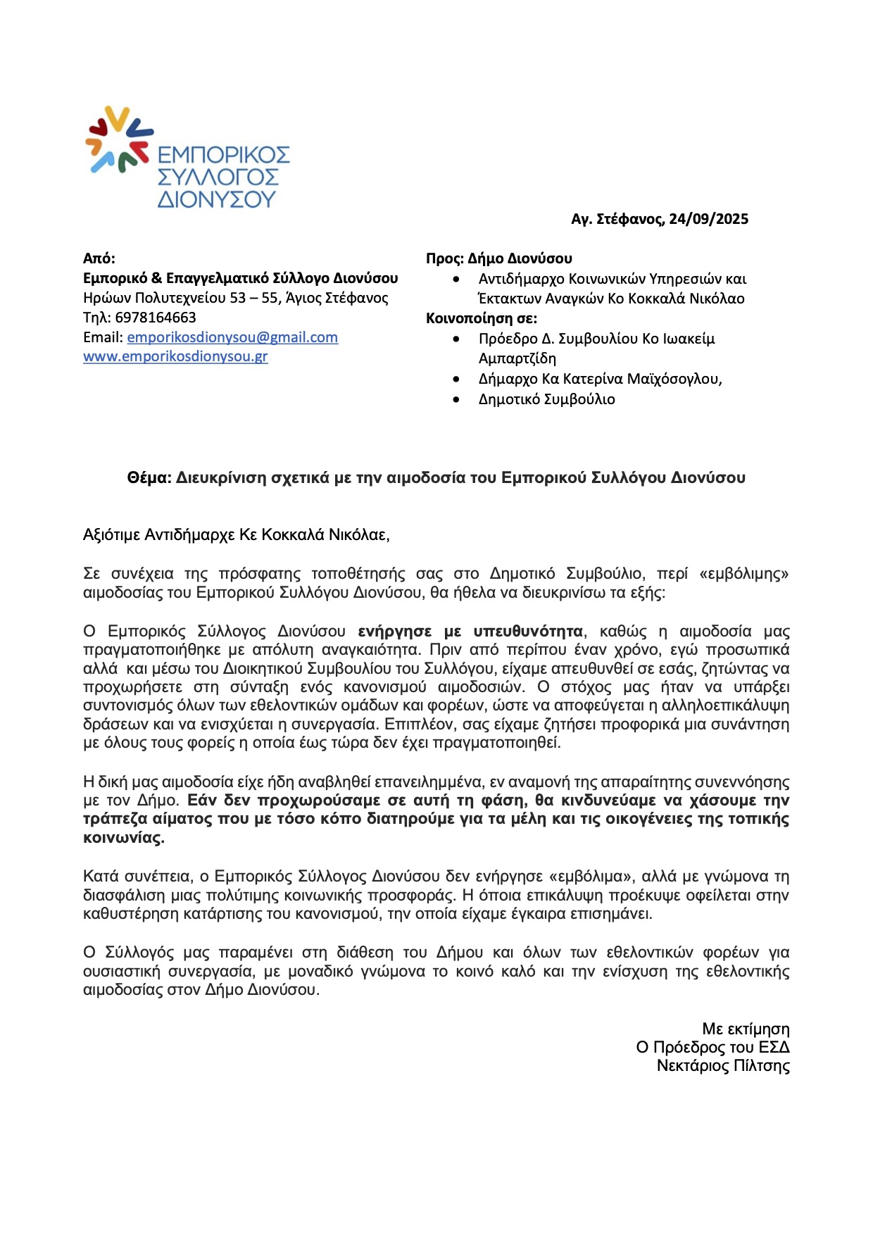 Η αναφορά αυτή προκάλεσε την άμεση αντίδραση του Εμπορικού Συλλόγου Διονύσου, που με επιστολή του απευθυνόμενη προς την Αντιδημαρχία και κοινοποιημένη στον Πρόεδρο και στο Δημοτικό Συμβούλιο, καθώς και στη Δήμαρχο, επιρρίπτει ευθύνες στον Αντιδήμαρχο για ολιγωρία σχετικά με τον Κανονισμό της αιμοδοσίας και διευκρινίζει σχετικά: