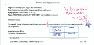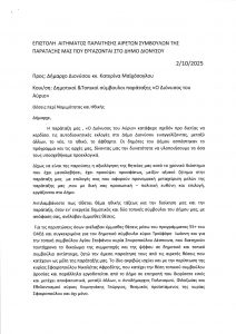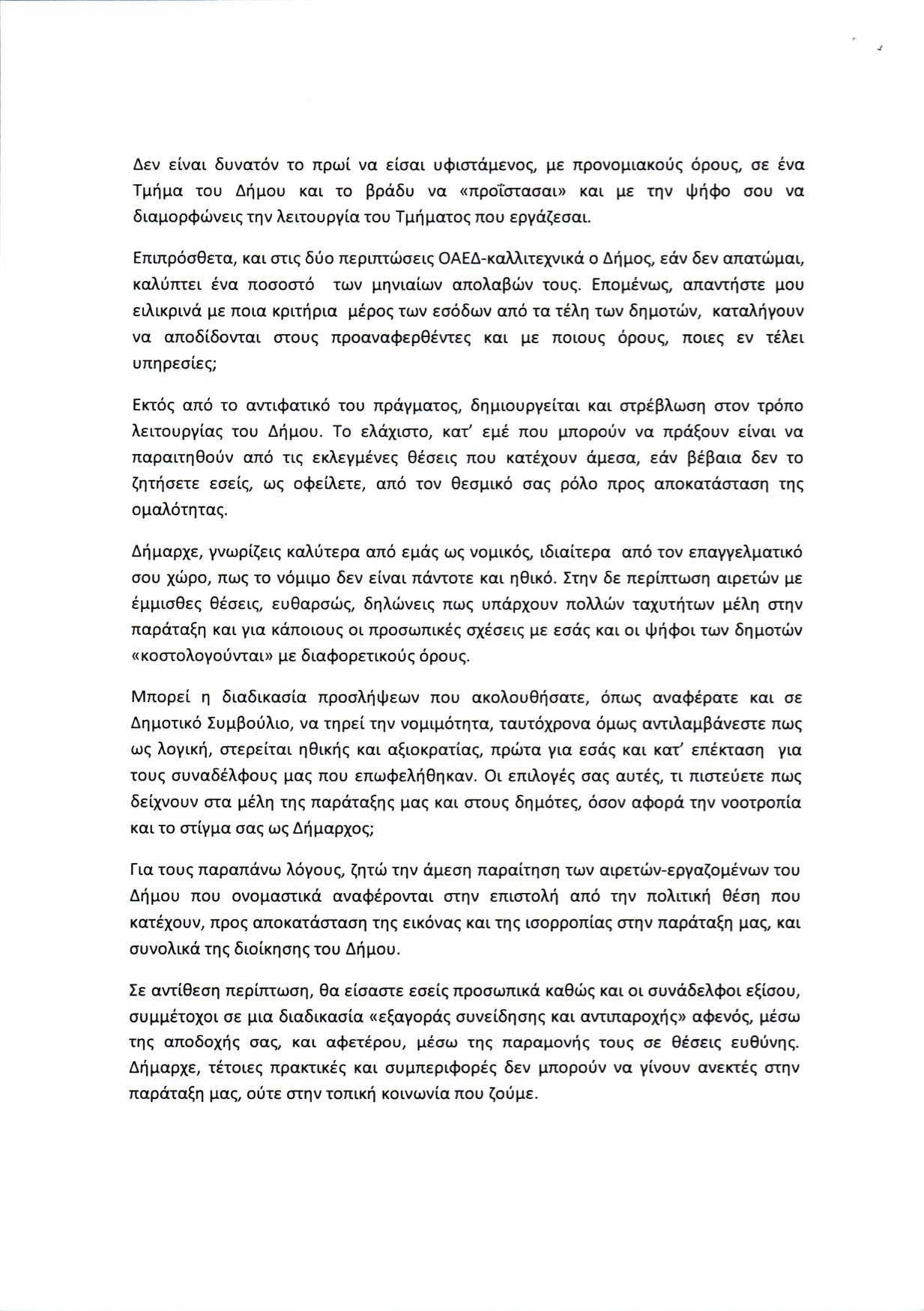 Σήμερα Παρασκευή 3 Σεπτεμβρίου, ο Πρόεδρος του Δημοτικού Συμβουλίου Ιω. Αμπαρτζίδης πρωτοκόλλησε επιστολή προς τη Δήμαρχο Διονύσου Κ. Μαϊχόσογλου, με κοινοποίηση προς όλους τους δημοτικούς και και τοπικούς συμβούλους της παράταξης της Διοίκησης, με την οποία καλεί ονομαστικά τρεις αιρετούς της παράταξης της πλειοψηφίας- Γ. Τραϊφόρος δημοτικός σύμβουλος, Δ. Σπυροπούλου τοπική σύμβουλος Αγ. Στεφάνου και Α. Σφαιροπούλου τοπική σύμβουλος Δροσιάς- που προσελήφθησαν προσφάτως σε έμμισθες θέσεις στο Δήμο, να παραιτηθούν από τα αξιώματά τους. Διαφορετικά, “θα είστε εσείς προσωπικά καθώς και οι συνάδελφοι εξίσου, συμμέτοχοι σε μια διαδικασία “εξαγοράς συνείδησης και αντιπαροχής” αφενός μέσω της αποδοχής σας, και αφετέρου, μέσω της παραμονής τους σε θέση ευθύνης”.