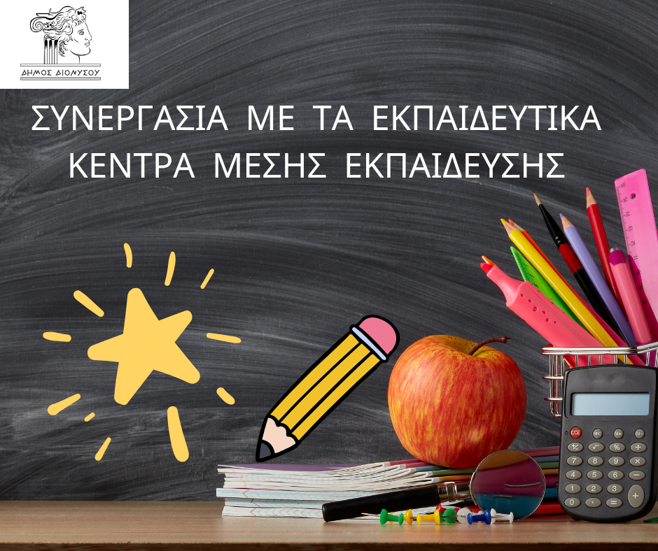 Το Τμήμα Παιδείας του Δήμου Διονύσου, στο πλαίσιο ενίσχυσης της κοινωνικής αλληλεγγύης και της ισότητας ευκαιριών στην εκπαίδευση, ανακοινώνει τη συνεργασία του με τα Εκπαιδευτικά Κέντρα Μέσης Εκπαίδευσης Αντίληψη, Απόλυτο, Διακρότημα, Έρεισμα, Λίλη Θεοδώρου και Σύγχρονη Τομή, καθώς και τα Κέντρα Ξένων Γλωσσών Λυκάρη, Μπέτσης και Learning in Wonderland.