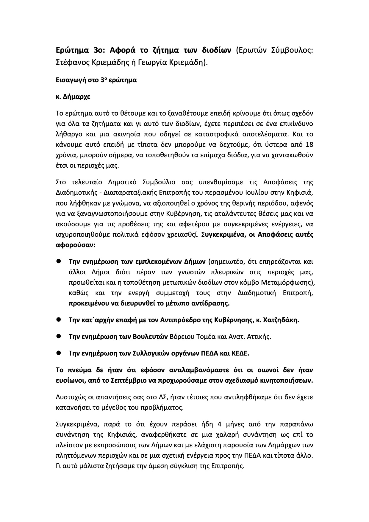Στο τελευταίο Δημοτικό Συμβούλιο σας υπενθυμίσαμε τις Αποφάσεις της Διαδημοτικής – Διαπαραταξιακής Επιτροπής του περασμένου Ιουλίου στην Κηφισιά, που λήφθηκαν με γνώμονα, να αξιοποιηθεί ο χρόνος της θερινής περιόδου, αφενός για να ξαναγνωστοποιήσουμε στην Κυβέρνηση, τις αταλάντευτες θέσεις μας και να ακούσουμε για τις προθέσεις της και αφετέρου με συγκεκριμένες ενέργειες, να ισχυροποιηθούμε πολιτικά εφόσον χρειασθεί. Συγκεκριμένα, οι Αποφάσεις αυτές αφορούσαν: