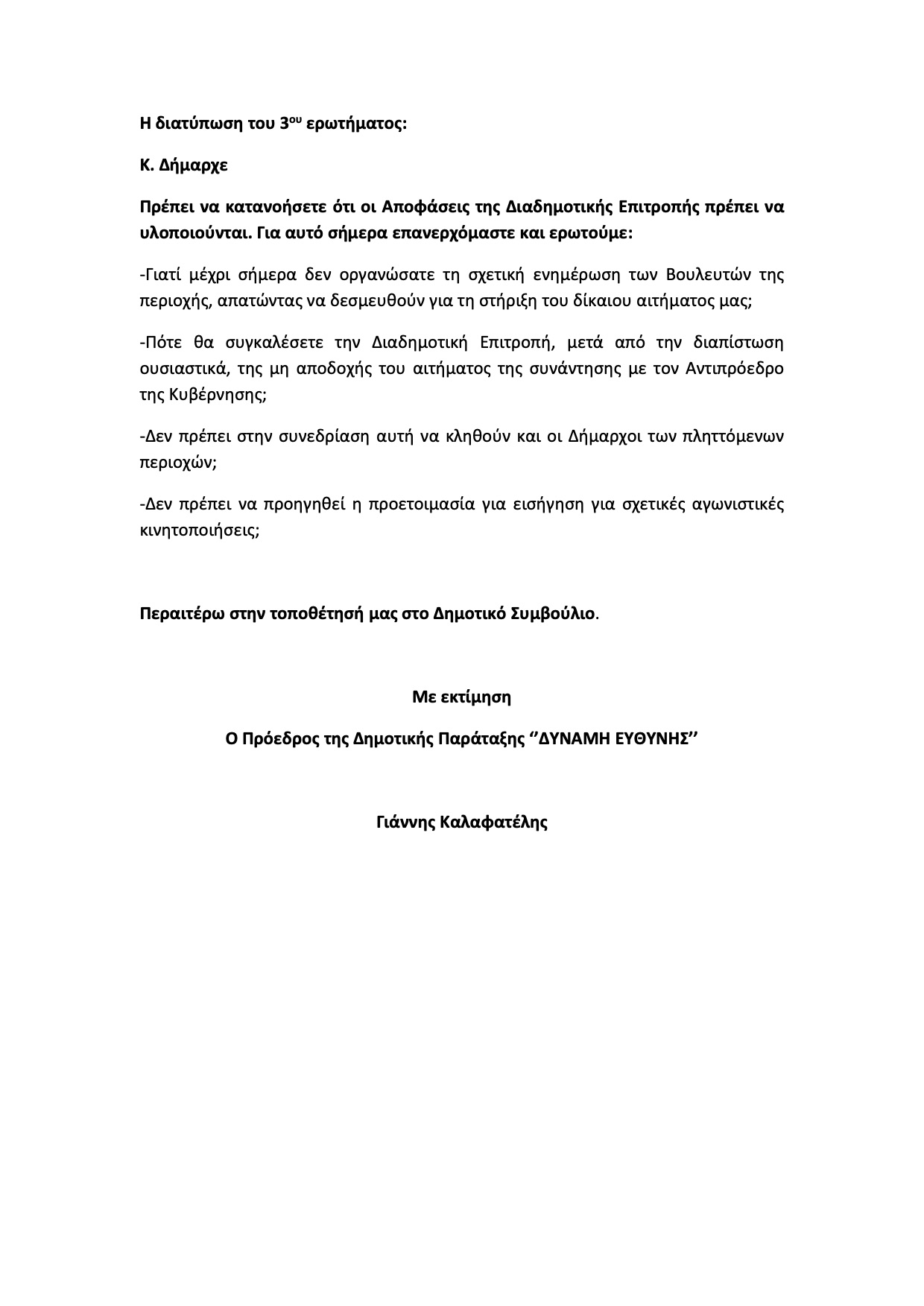 -Πότε θα συγκαλέσετε την Διαδημοτική Επιτροπή, μετά από την διαπίστωση ουσιαστικά, της μη αποδοχής του αιτήματος της συνάντησης με τον Αντιπρόεδρο της Κυβέρνησης;