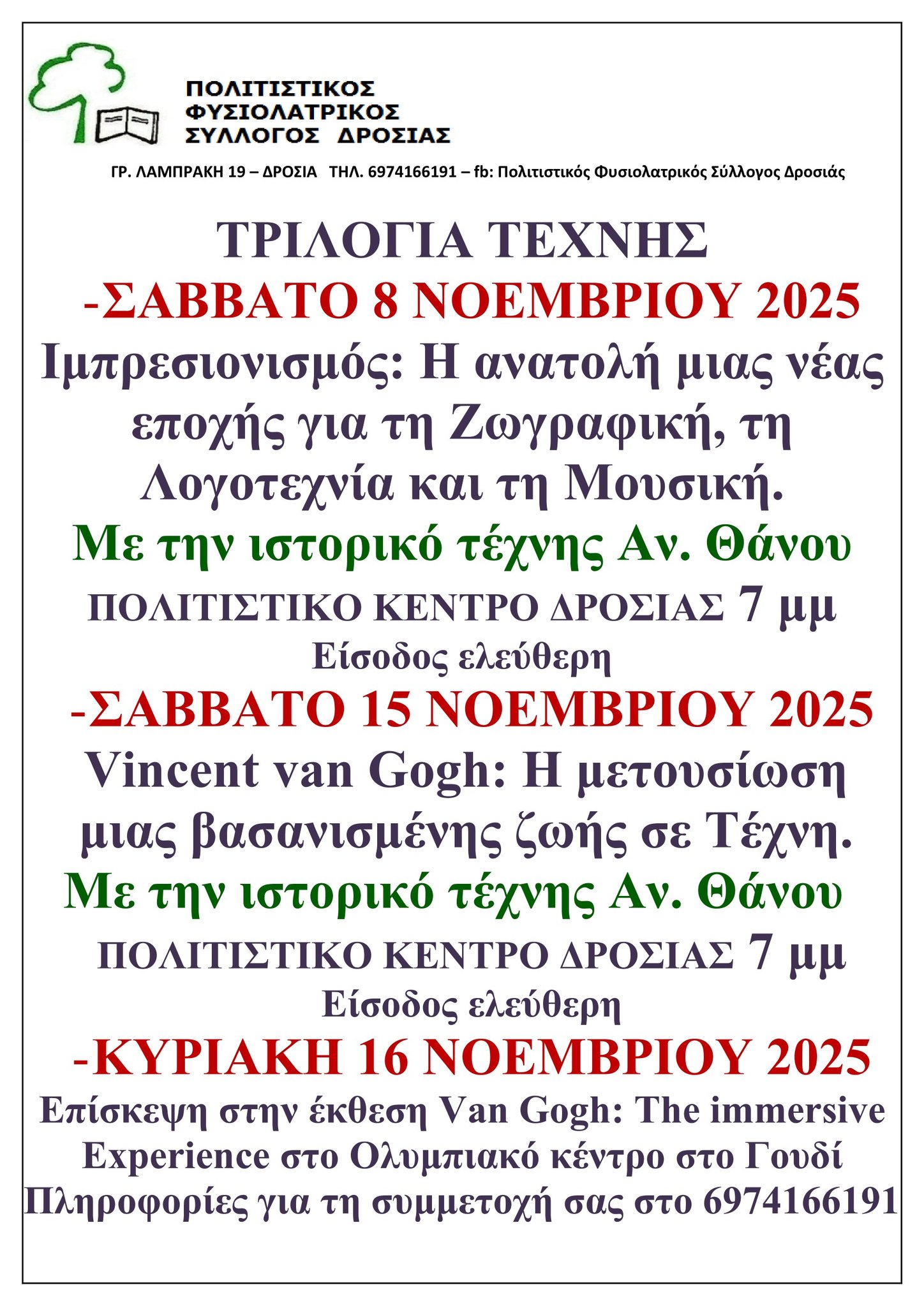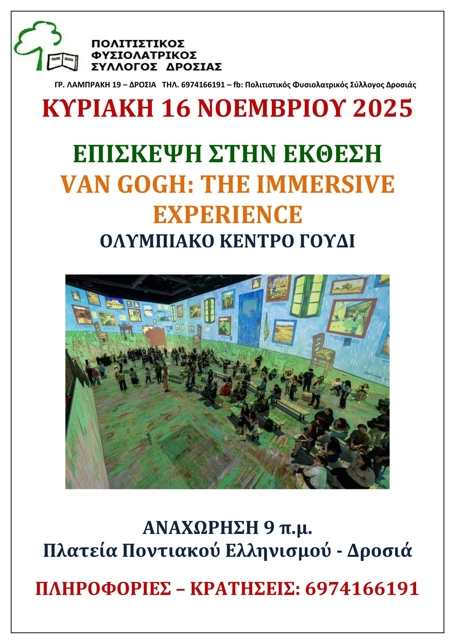 καθώς και επίσκεψη στην έκθεση Van Gogh στο Ολυμπιακό Κέντρο Γουδή, την Κυριακή 16 Νοεμβρίου