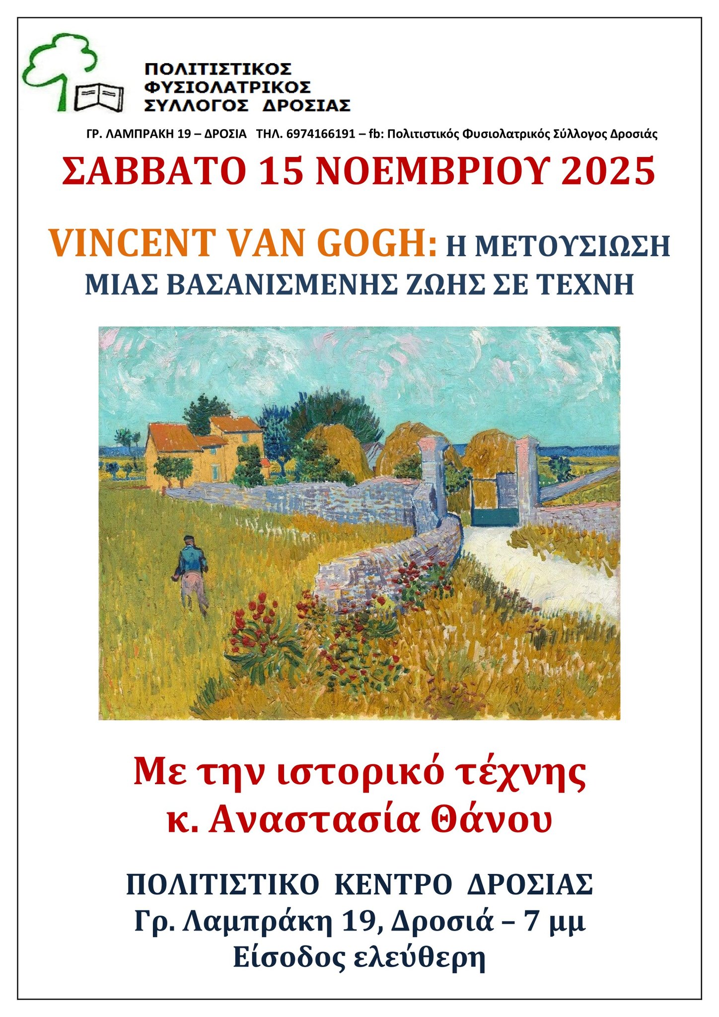 και για τον Van Gogh (Σάββατο 15 Νοεμβρίου) στο Πολιτιστικό Κέντρο της Δροσιάς,