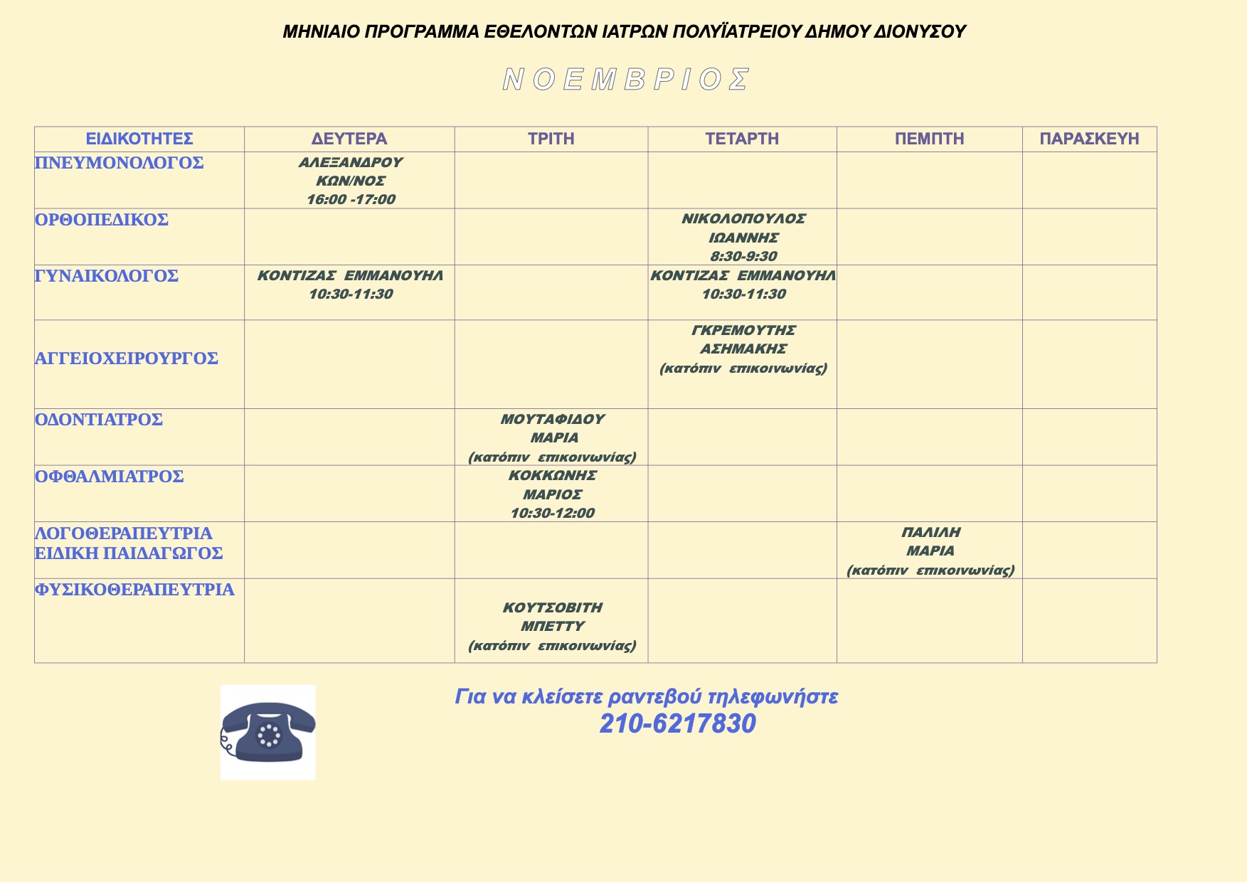 Για το μήνα Νοέμβριο το πρόγραμμα επισκέψεων στους εθελοντές γιατρούς του Δημοτικού Πολυϊατρείου Διονύσου, έχει διαμορφωθεί ως εξής: