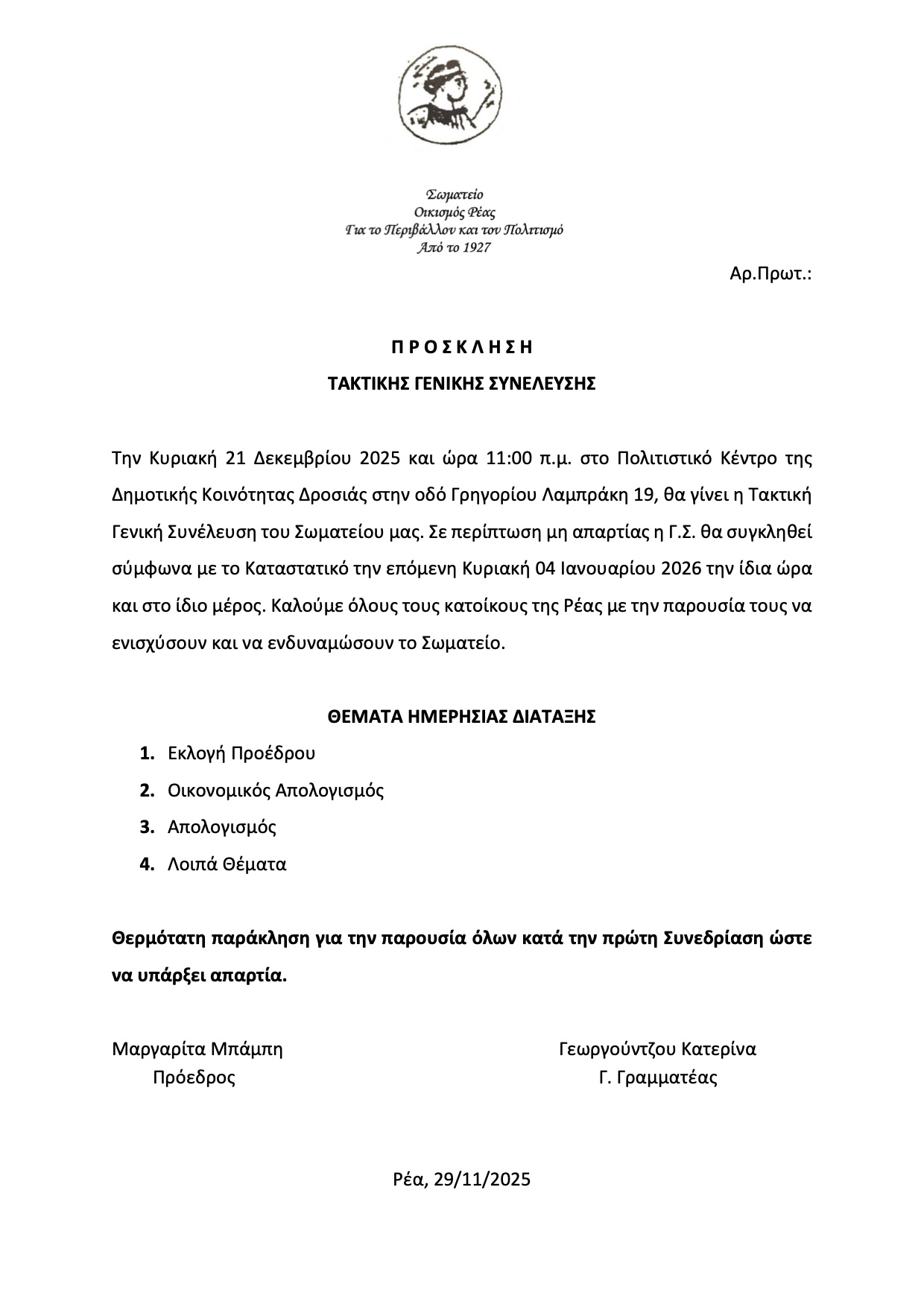Σε Γενική Συνέλευση, την Κυριακή 21 Δεκεμβρίου και ώρα 11πμ στο Πολιτιστικό Κέντρο της Δροσιάς (Γρ. Λαμπράκη 19), καλεί τα μέλη του το Σωματείο «Οικισμός Ρέας για το Περιβάλλον και τον Πολιτισμό”, απευθύνοντας θερμή παράκληση για την παρουσία όλων ώστε να υπάρξει απαρτία. Το Σωματείο τονίζει, επιπλέον, την ανάγκη να ανανεωθεί το Διοικητικό Συμβούλιό του από νέα πρόσωπο με φρέσκες ιδέες και καλεί τα μέλη να καταθέσουν τις απόψεις τους για μια σειρά ζητημάτων, όπως- ενδεικτικά- η καθαριότητα, η αποχέτευση, η φύλαξη, η πυρασφάλεια κ.λπ.: