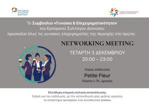 Το Συμβούλιο «Γυναίκα & Επιχειρηματικότητα» του Εμπορικού Συλλόγου Διονύσου σας προσκαλεί στην 1η συνάντηση δικτύωσης γυναικών επιχειρηματιών της περιοχής.
