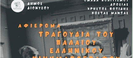 Η Ομάδα Πολιτισμού Δροσιάς και ο Δήμος Διονύσου οργανώνουν μουσική βραδιά με τραγούδια από τον παλιό ελληνικό κινηματογράφο τη Δευτέρα 15 Δεκεμβρίου στις 8μμ στο Πολιτιστικό Κέντρο[...]