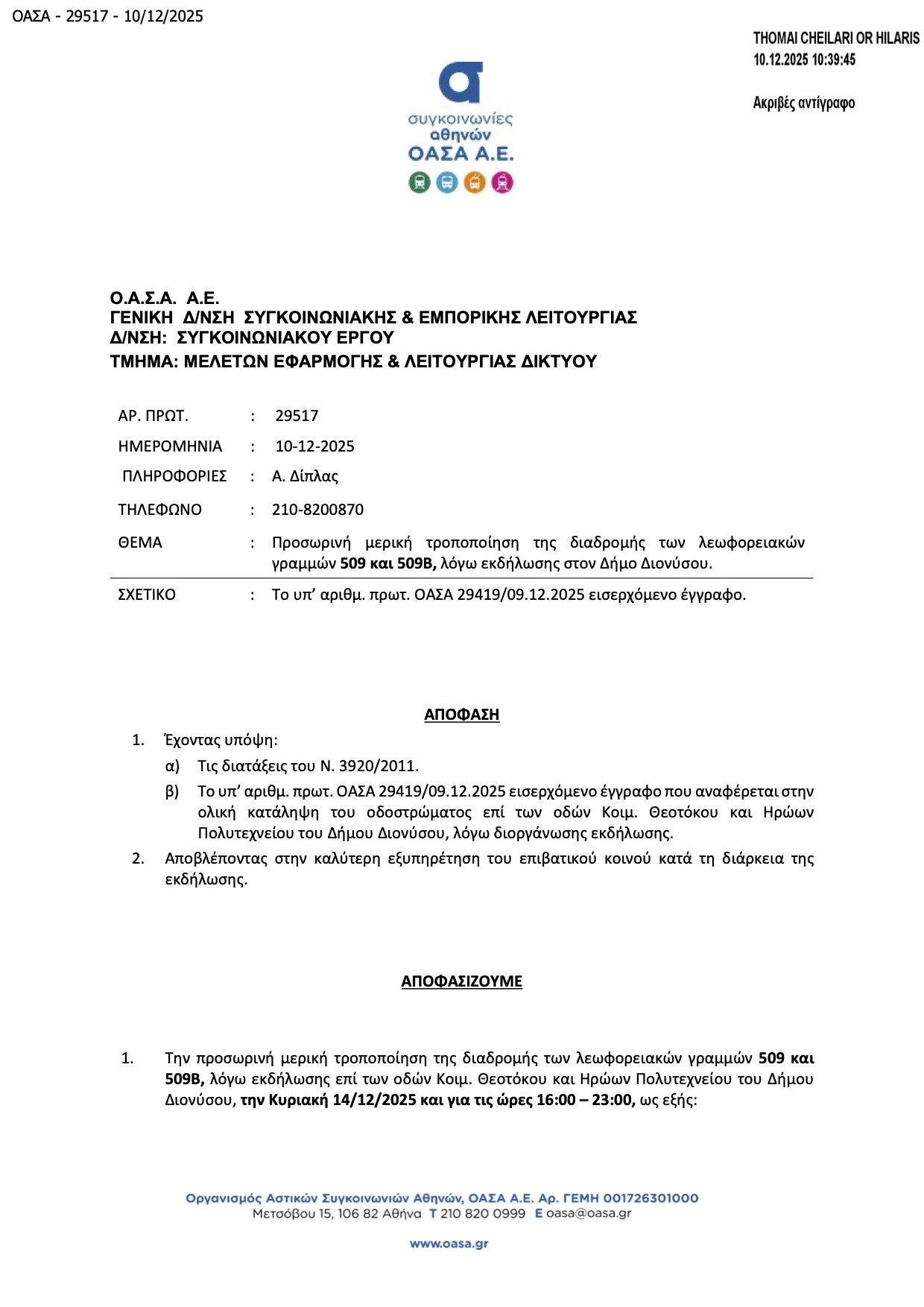 Ο Δήμος Διονύσου ενημερώνει το επιβατικό κοινό ότι την Κυριακή 14 Δεκεμβρίου 2025, και από ώρα 14:00 έως 23:00, θα ισχύσει μερική προσωρινή τροποποίηση στη διαδρομή των λεωφορειακών γραμμών 509 και 509Β, λόγω της χριστουγεννιάτικης εκδήλωσης που θα πραγματοποιηθεί στον Άγιο Στέφανο.