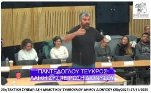 Μια ημέρα αργότερα το θέμα ήρθε και στο Δημοτικό Συμβούλιο με ερώτηση του κ. Παντελόγλου αναφορικά με τις ενέργειες που η Διοίκηση Μαϊχόσογλου προγραμματίζει σχετικά. Παράλληλα ο επικεφαλής της Λαϊκής Συσπείρωσης υπενθύμισε πως ο οικίσκος βρίσκεται σε δημόσια έκταση χαρακτηρισμένη από το 1979 ως σχολική με Νομαρχιακή απόφαση, ενώ οι διεκδικήσεις του Δασαρχείου ξεκίνησαν αίφνης όταν ο τότε Οργανισμός Σχολικών Κτηρίων (ΟΣΚ) ξεκίνησε την ανέγερση του 2ου Δημοτικού και του 2ου Νηπιαγωγείου Διονύσου. Στα 1998 το Υπουργείο Γεωργίας παραχώρησε τον οικίσκο στον ΟΣΚ για να διαμορφώσει κατάλληλα το προαύλιο του Νηπιαγωγείου, η παραχώρηση όμως αυτή ματαιώθηκε λόγω αντίδρασης από το Δασαρχείο, με αποτέλεσμα ο ΟΣΚ να μπαζώσει χώρο για να εξασφαλίσει το προαύλιο, αυτό που κυριολεκτικά βρίσκεται στον αέρα και πάσχει από συνεχείς καθιζήσεις, ενώ εκεί συνωστίζονται και προαυλίζονται τα νήπια. Το 2006 με έγγραφό του το Δασαρχείο εισηγείται την παραχώρηση του οικίσκου στο Νηπιαγωγείο, αλλά έκτοτε και για 20 περίπου χρόνια όλες οι συναρμόδιες υπηρεσίες ανταλλάσσουν έγγραφα και η μια μεταθέτει τις ευθύνες και τη λήψη απόφασης στην άλλη, συμπλήρωσε ο κ. Παντελόγλου, κατηγορώντας όλες τις Δημοτικές Αρχές για αδυναμία αποτελεσματικής υπεράσπισης των σχολικών χώρων, αλλά και συνολικά της δημοτικής περιουσίας.