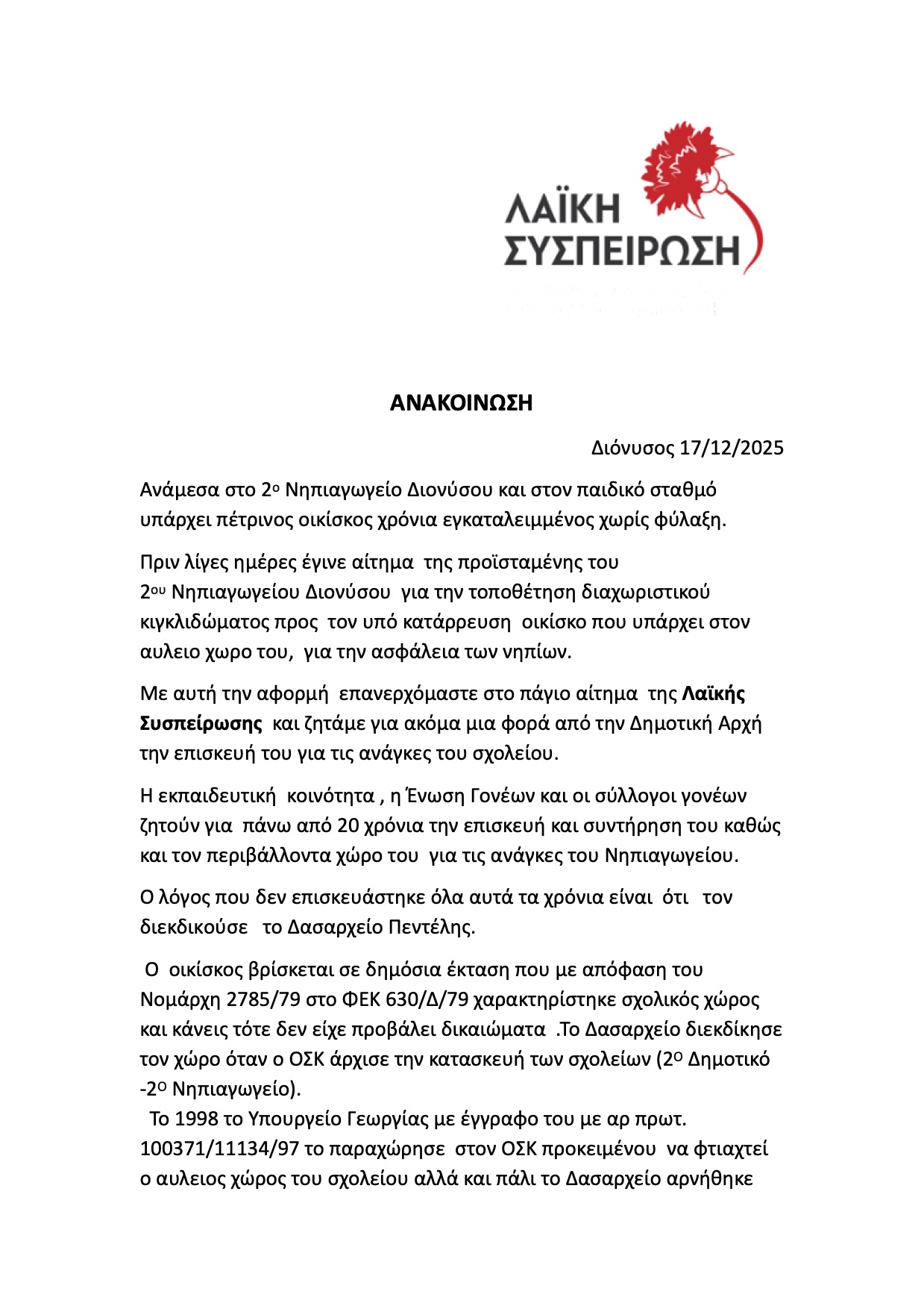 Τρία χρόνια έχουν περάσει από τότε, τον Νοέμβριο του 2022, που ο Σύλλογος Γονέων του 2ου Νηπιαγωγείου Διονύσου και η Λαϊκή Συσπείρωση με τον Τ. Παντελόγλου έφερναν στο Δημοτικό Συμβούλιο την καθίζηση στο προαύλιο του σχολείου σε συνάρτηση με τις διεκδικήσεις του Δασαρχείου σε έκταση χαρακτηρισμένη ως σχολική, όπου βρίσκεται οικίσκος, γνωστός στην περιοχή ως το σπιτάκι του δασοφύλακα.