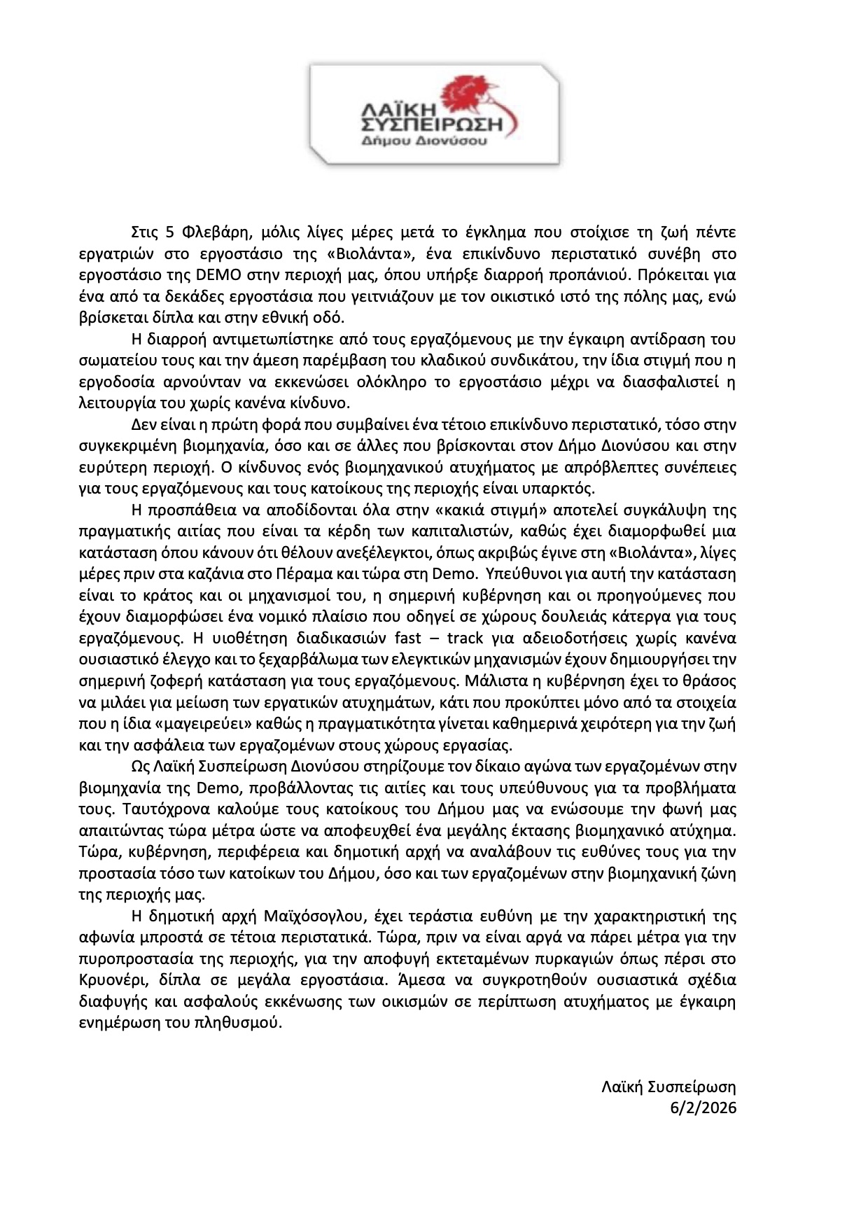 Ως Λαϊκή Συσπείρωση Διονύσου στηρίζουμε τον δίκαιο αγώνα των εργαζομένων στην βιομηχανία της Demo, προβάλλοντας τις αιτίες και τους υπεύθυνους για τα προβλήματά τους. Ταυτόχρονα καλούμε τους κατοίκους του Δήμου μας να ενώσουμε την φωνή μας απαιτώντας τώρα μέτρα ώστε να αποφευχθεί ένα μεγάλης έκτασης βιομηχανικό ατύχημα. Τώρα, κυβέρνηση, περιφέρεια και δημοτική αρχή να αναλάβουν τις ευθύνες τους για την προστασία τόσο των κατοίκων του Δήμου, όσο και των εργαζομένων στην βιομηχανική ζώνη της περιοχής μας.