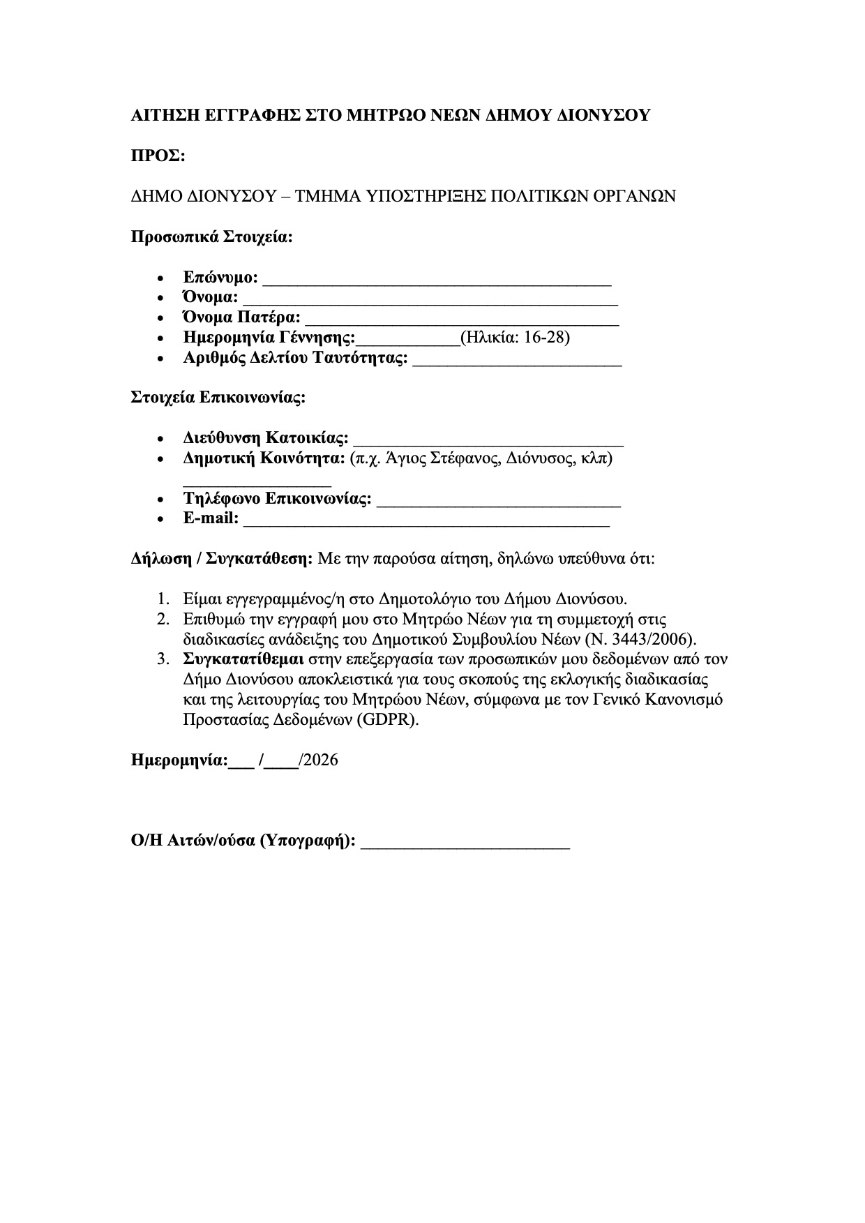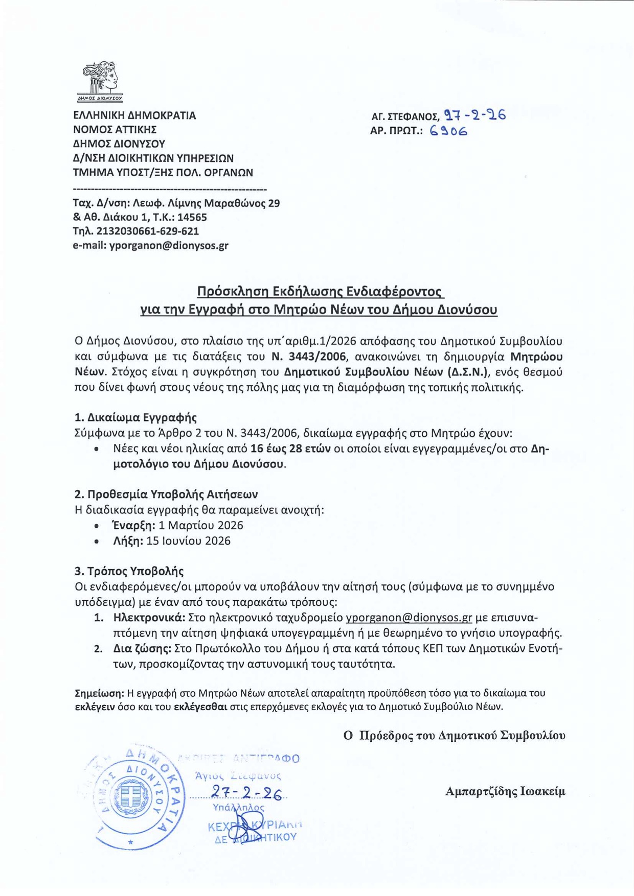 Με πρόσκλησή του ο Πρόεδρος του Δημοτικού Συμβουλίου Διονύσου Ιω. Αμπαρτζίδης καλεί τους δημότες, ηλικίας από 16 έως 28 ετών, να εγγραφούν στο Μητρώο Νέων, προκειμένου να συσταθεί το Δημοτικό Συμβούλιο Νέων.
