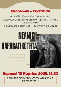 Την Κυριακή 15 Μαρτίου στις 6.30 το βράδυ η Ομάδα ΟΓΕ Διονύσου και ο Σύλλογος Εκπαιδευτικών Πρωτοβάθμιας Εκπαίδευσης Αν. Αττικής Ο ΣΩΚΡΑΤΗΣ θα πραγματοποιήσει στο Πολιτιστικό Κέντρο Αγ. Στεφάνου εκδήλωση με θέμα τη νεανική παραβατικότητα: