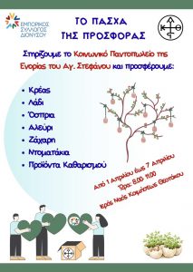 Φέτος, σε συνεργασία με την Ενορία του Αγίου Στεφάνου, στηρίζουμε έμπρακτα το Κοινωνικό Παντοπωλείο της. Η Ενορία επιτελεί ένα πραγματικά θεάρεστο έργο, προσφέροντας καθημερινά ανακούφιση σε άπορες οικογένειες που δυσκολεύονται να καλύψουν ακόμα και τις βασικές τους ανάγκες.