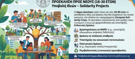 ΑΝΑΚΟΙΝΩΣΗ Ο Δήμος Διονύσου καλεί νέους και νέες 18-30 ετών να καταθέσουν ιδέες για δράσεις που θα ενισχύσουν την τοπική κοινωνία, στο πλαίσιο του προγράμματος European Solidarity [...]