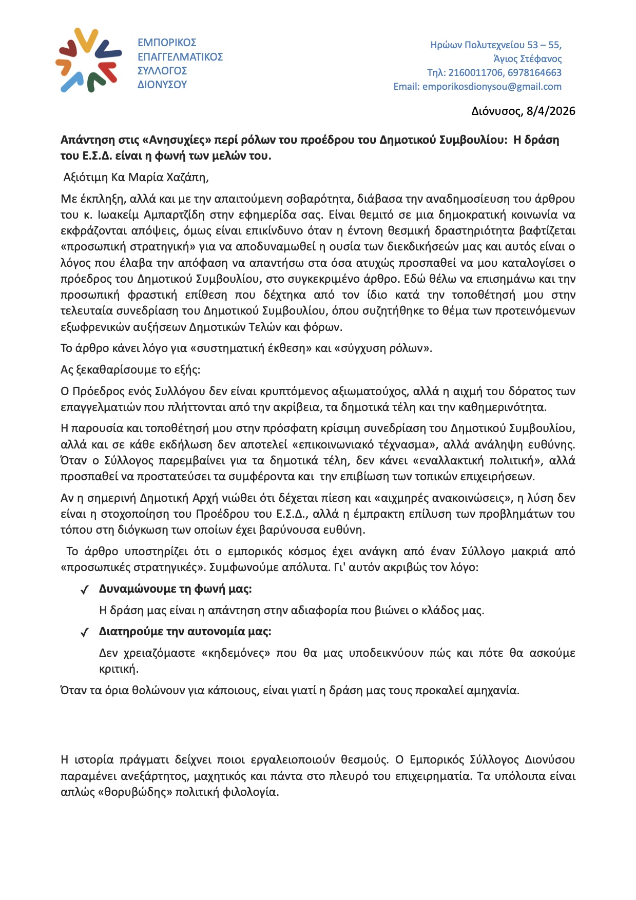 Απάντηση στο πρόσφατο άρθρο του Προέδρου του Δημοτικού Συμβουλίου Ιω. Αμπαρτζίδη περί ρόλων και υπέρβασής τους δίνει ο Εμπορικός Σύλλογος Διονύσου, δια του Προέδρου του Ν. Πίλτση, δίνοντας συνέχεια στην κόντρα που ξέσπασε πριν από 8 ημέρες στο Δημοτικό Συμβούλιο (31/3) με αφορμή τις αυξήσεις στα δημοτικά τέλη:
