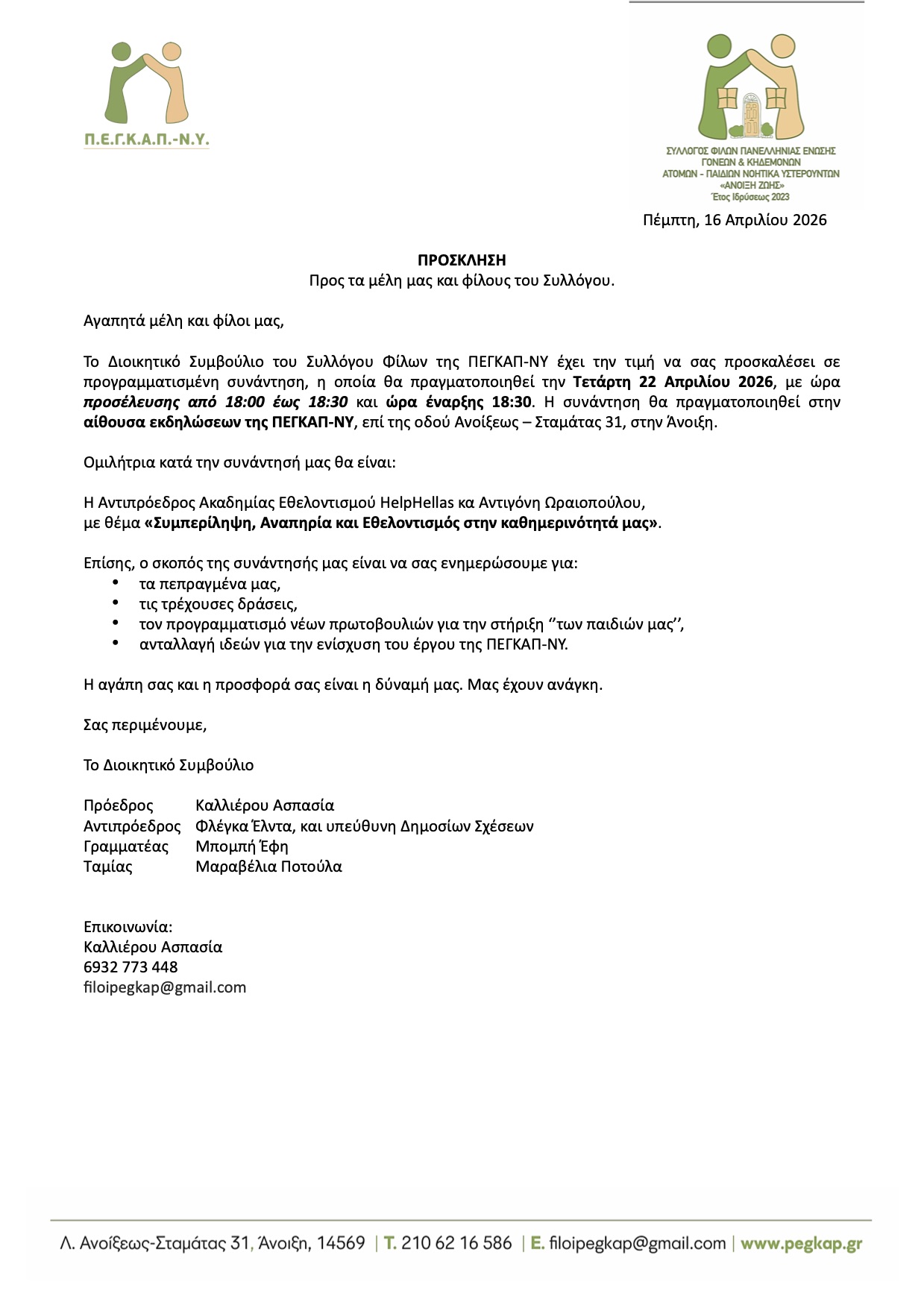 Το Διοικητικό Συμβούλιο του Συλλόγου Φίλων της ΠΕΓΚΑΠ-ΝΥ έχει την τιμή να σας προσκαλέσει σε προγραμματισμένη συνάντηση, η οποία θα πραγματοποιηθεί την Τετάρτη 22 Απριλίου 2026, με ώρα προσέλευσης από 18:00 έως 18:30 και ώρα έναρξης 18:30. Η συνάντηση θα πραγματοποιηθεί στην αίθουσα εκδηλώσεων της ΠΕΓΚΑΠ-ΝΥ, επί της οδού Ανοίξεως – Σταμάτας 31, στην Άνοιξη.