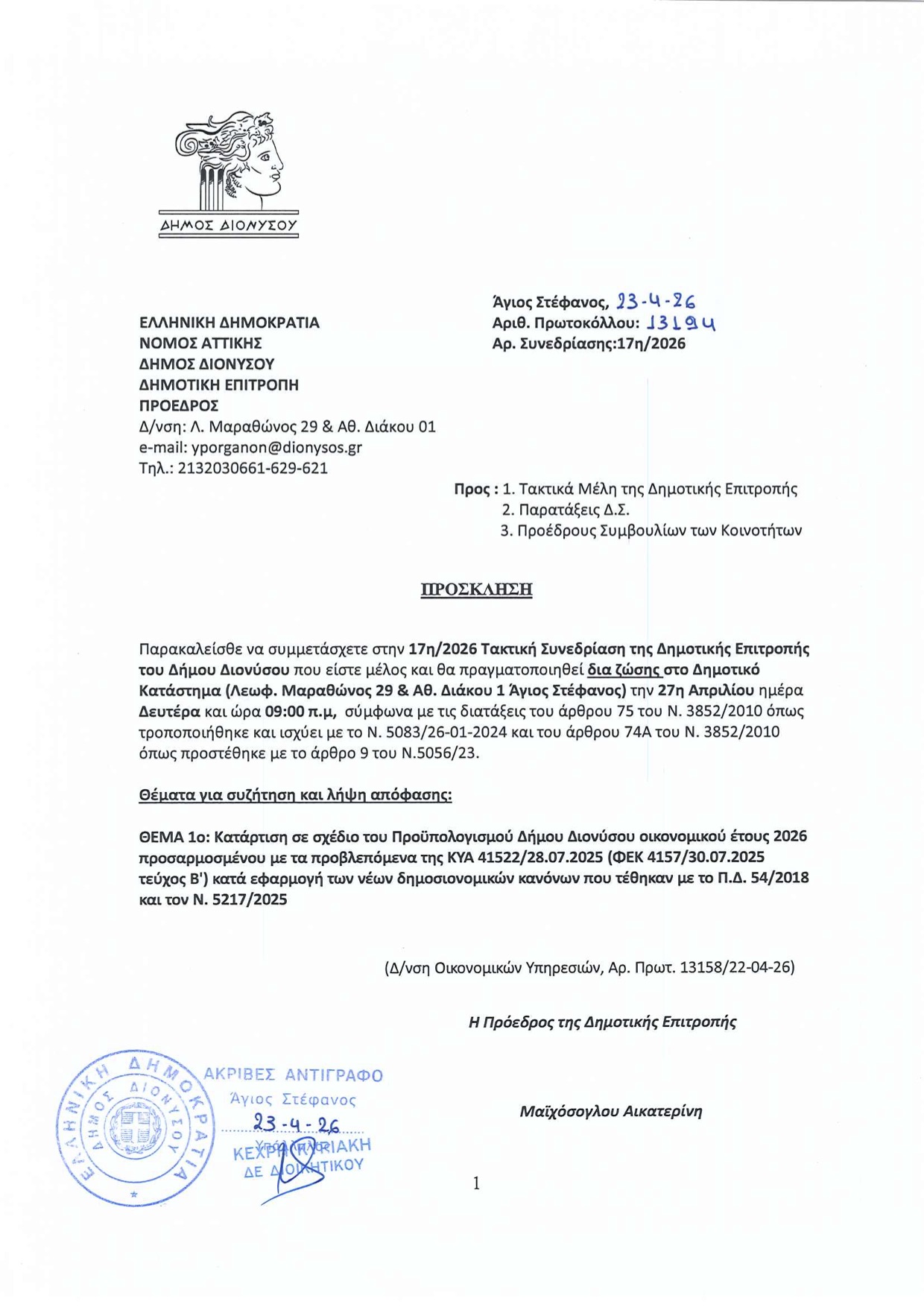 Αποστέλλει πρόσκληση την Πέμπτη το μεσημέρι 23/04/2026 για συνεδρίαση τη Δευτέρα 27/04/2016 στις 09.00 π.μ. , για τον Προϋπολογισμό — το κορυφαίο εργαλείο διοίκησης του Δήμου και μάλιστα με πεντάμηνη καθυστέρηση.