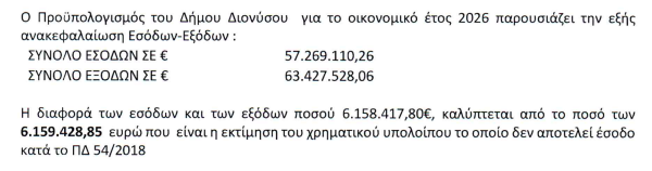 Σύμφωνα με την ίδια εισήγηση, ο Προϋπολογισμός του Δήμου για το 2026 παρουσιάζει απόκλιση 6,2 εκατομμυρίων ευρώ περίπου μεταξύ εσόδων (57,2 εκατομμύρια ευρώ) και εξόδων (63,4 εκατομμύρια ευρώ), που καλύπτονται από το κατ’ εκτίμηση χρηματικό υπόλοιπο, το οποίο δε λογίζεται ως έσοδο.